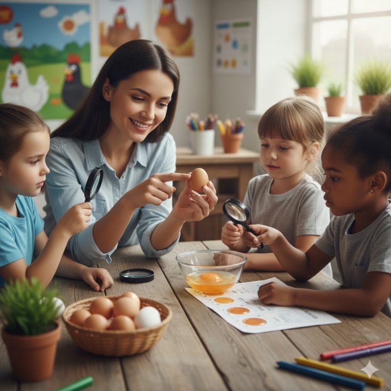 Allowing children to directly observe eggs, sketch them, or explore their internal structure is an engaging and effective way of learning.